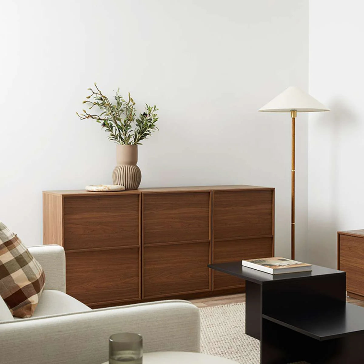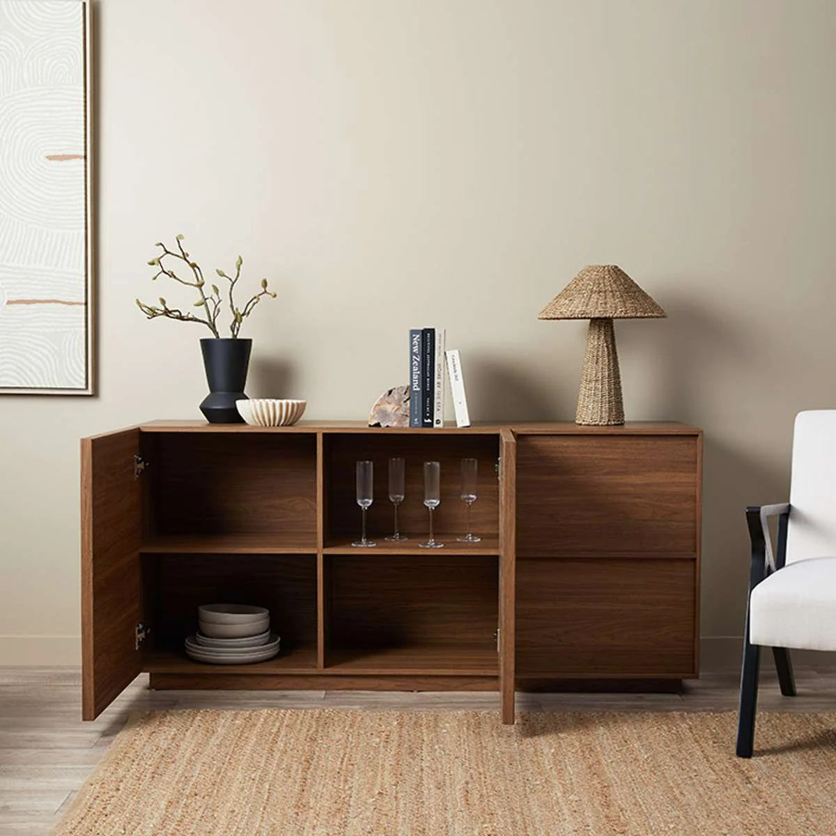 Inspiré du design du milieu du siècle, le buffet Osaka en noyer foncé offre de nombreux rangements grâce à ses portes élégantes à bords encadrés. Idéal pour le salon ou la salle à manger, son cadre en MDF imitation bois apporte une touche d'élégance intemporelle. Ce buffet trois portes est à la fois élégant et fonctionnel, ce qui en fait un ajout polyvalent à tout intérieur.